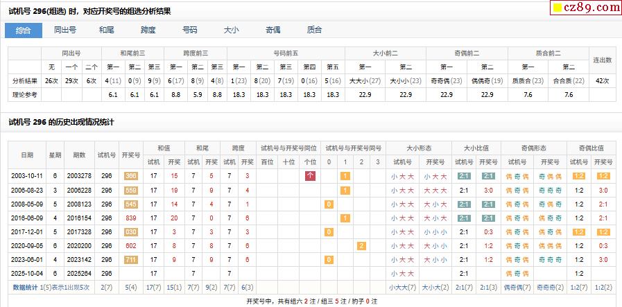 264期福彩3D试机号296对应开奖号的组选分析结果